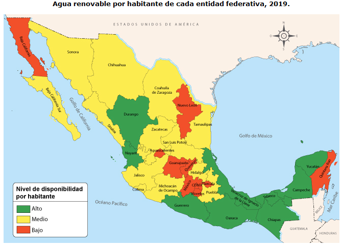 Como resultado del crecimiento poblacional en México, la disponibilidad del agua por persona, ha disminuido considerablemente en las últimas décadas. Según estadísticas del Instituto Nacional de Estadística y Geografía (INEGI), en 1910 la disponibilidad promedio del agua por habitante fue de 31 mil m³, en 1950 poco más de 18 mil m³, en 1970 siguió disminuyendo, tan solo alcanzó poco menos de 10 mil m³, en 2005 fue de 4,573 m³, y en el año 2019 la disponibilidad fue de 3,586 m³ anuales por cada habitante.