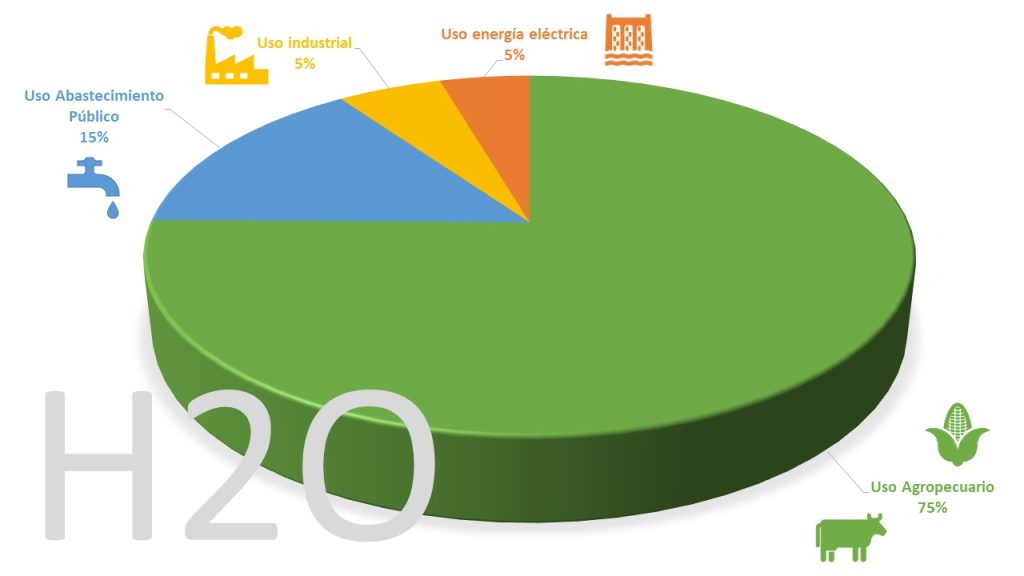 - Uso Agropecuario: De cada 100 litros de agua empleados en México, 75 litros son empleados en la agricultura y ganadería.