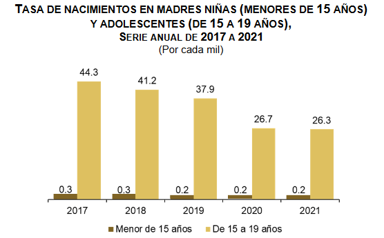 A continuación, se presenta una gráfica en las que se observan datos comparativos de la tasa de nacimientos en adolescentes y niñas que corresponden a los años de 2017-2021, realizado por el Inegi.
