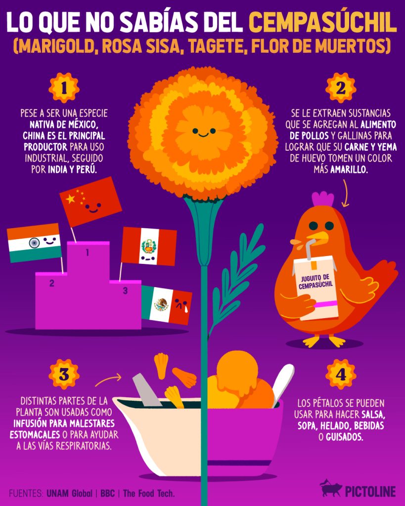 México se posiciona como el lugar de origen de la flor de cempasúchil, dada esta condición, el nombre de esta flor proviene del náhuatl Cempohualxochitl que significa veinte flores o varias flores. De acuerdo con el pensamiento de la bióloga María del Carmen López, describe que, “la flor de cempasúchil tiene una gran relevancia cultural al simbolizar la celebración del Día de Muertos en México“.