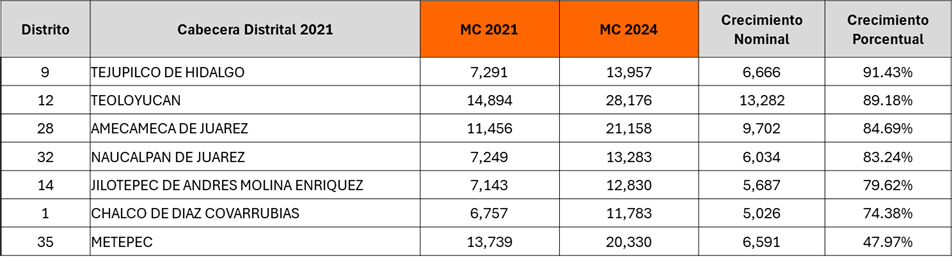 En 7 distritos locales MC incrementó su votación en un rango de 92 % a 47 %, los cuales se observan en el siguiente cuadro: