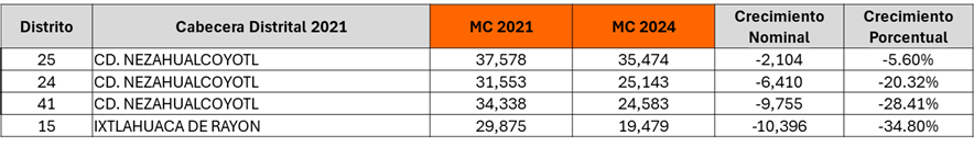 Cabe destacar que MC disminuyó su votación, únicamente, en 4 distritos locales, los cuales se muestran a continuación: