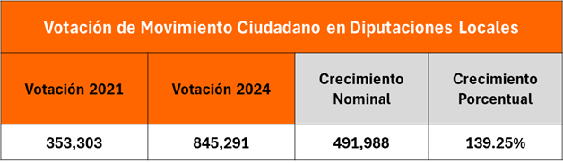 Con base en la tabla que corresponde a la votación obtenida por MC en las elecciones para diputaciones locales, se observa que; MC logró un crecimiento de 491,988 votos entre las elecciones de 2021-2024, lo que representa un margen de crecimiento de 139.25 %. En la elección para diputaciones locales del Edomex de 2021, MC obtuvo una votación de 353,303 votos, alcanzando el 5.28 % de la votación total. En relación con la elección de 2024, MC consiguió 845,291 votos, logrando el 10.11 % de la votación total de dicha elección.