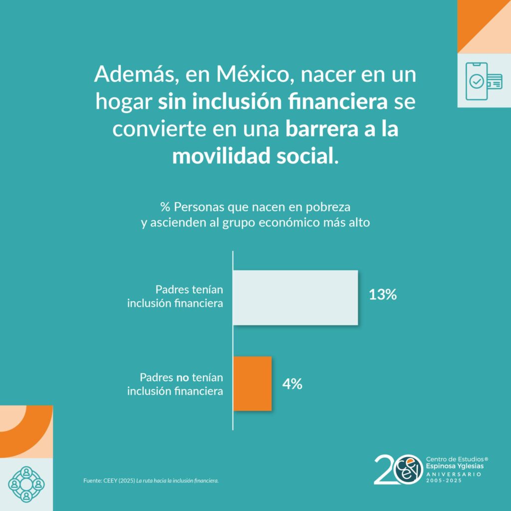 El informe La ruta hacia la inclusión financiera del Centro de Estudios Espinosa Yglesias (CEEY) revela que el acceso a servicios financieros en México es un factor determinante y hereditario. El acceso a servicios financieros influye sustancialmente en la movilidad social de la población. El informe se basa en la Encuesta ESRU de Movilidad Social en México 2023 (ESRU-EMOVI 2023), en donde se enfatiza la necesidad de políticas públicas que promuevan la inclusión y la educación financiera para romper el ciclo de la exclusión.