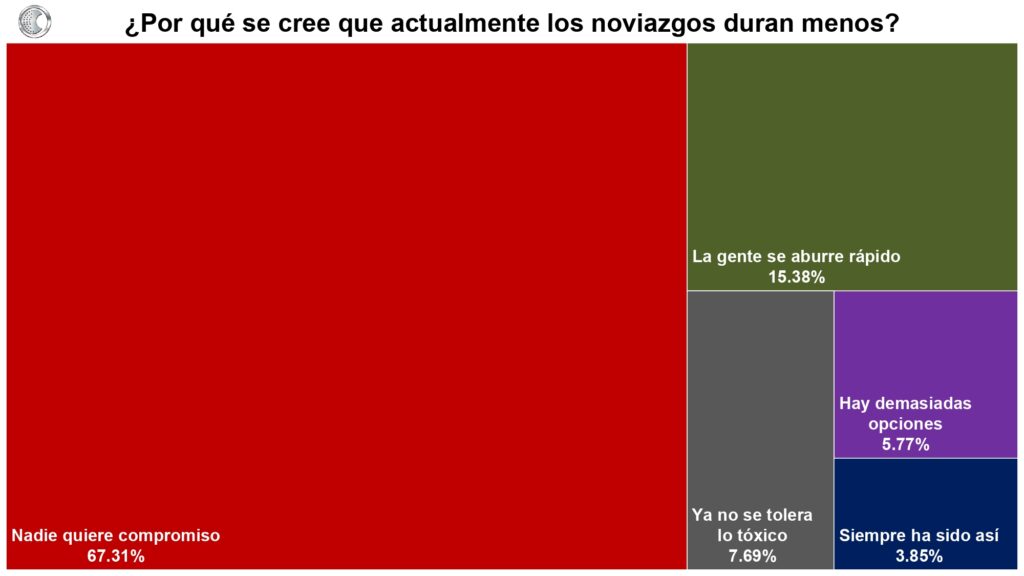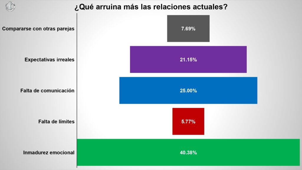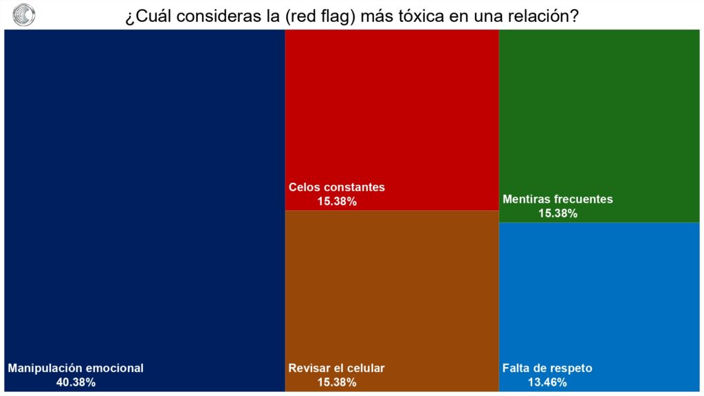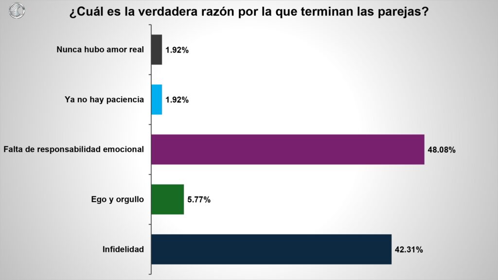 Otro de los datos más interesantes, no tiene que ver con compromiso ni con redes sociales digitales, sino con algo más profundo… la responsabilidad emocional. Cuando se preguntó a las y los encuestados qué arruina más las relaciones, la respuesta principal fue: inmadurez emocional. Cuando se preguntó cuál es la red flag más tóxica, la manipulación emocional encabeza la lista. Cuando se indagó por qué terminan las parejas, la falta de responsabilidad emocional superó incluso a la infidelidad.