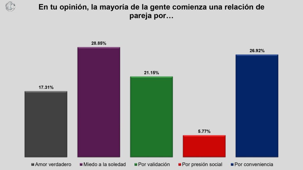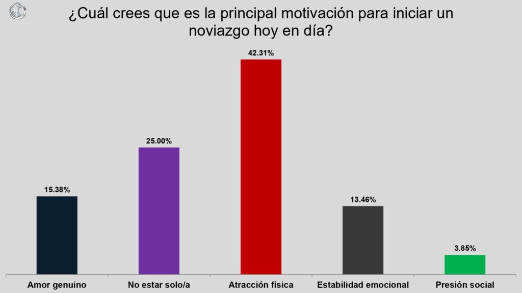 Respecto a las motivaciones para comenzar un noviazgo, declaran que la gente lo hace por miedo a la soledad; por conveniencia y por validación, superando éstas al amor verdadero como motivación inicial.
