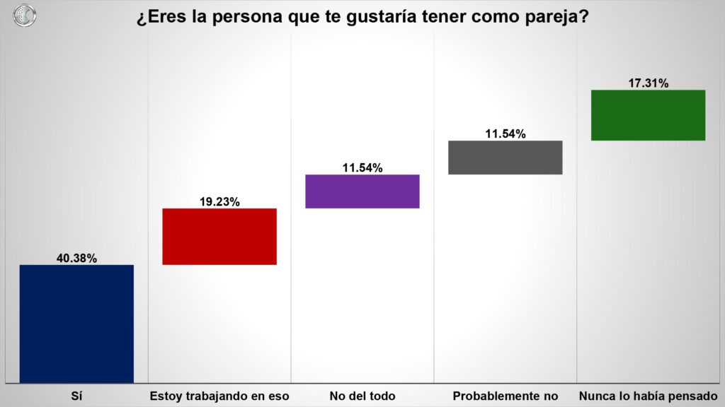 En el ámbito autorreflexivo, apenas cuatro de cada diez personas creen ser la pareja que ellas mismas elegirían. Cerca del 60 % reconoce que “no está completamente seguro (a)” o que está “trabajando en eso”. Por tanto, existe la autocrítica, hay conciencia, pero también se identifica un proceso individual puesto en marcha.